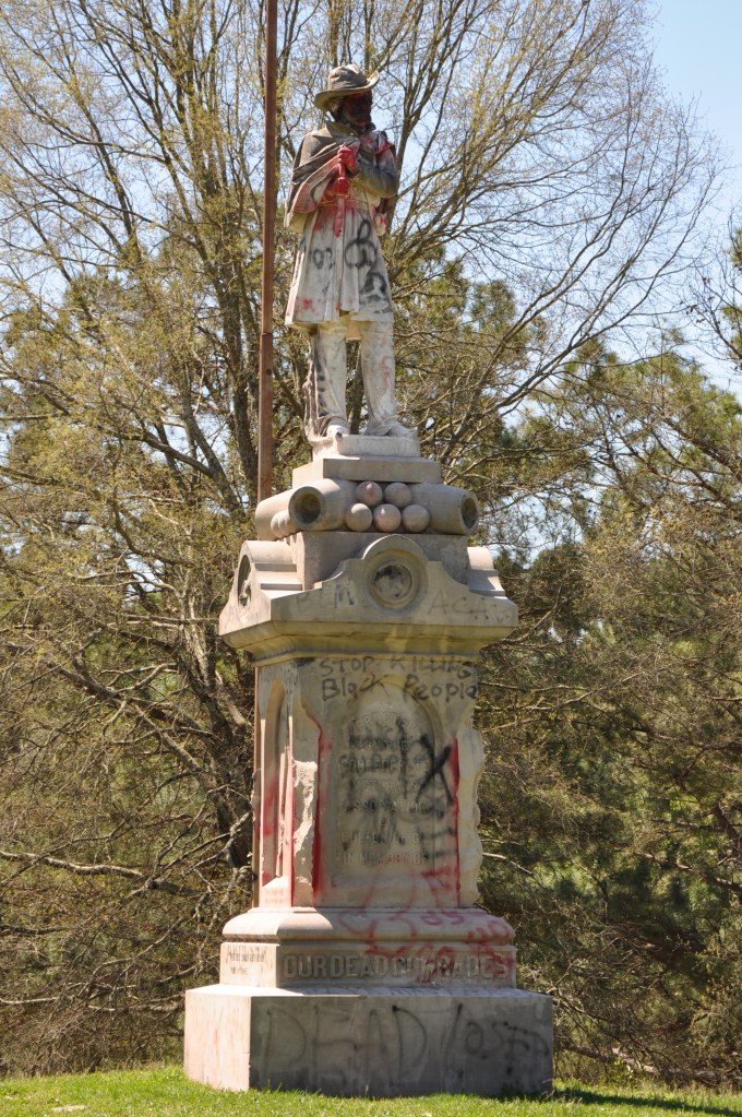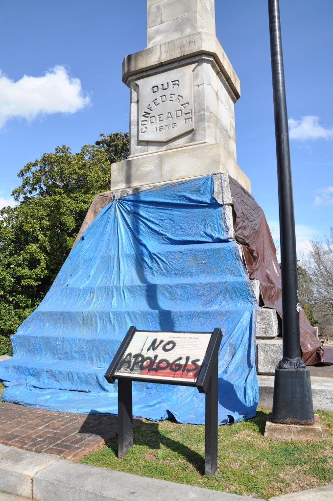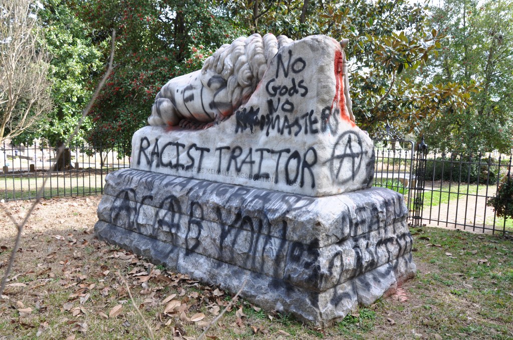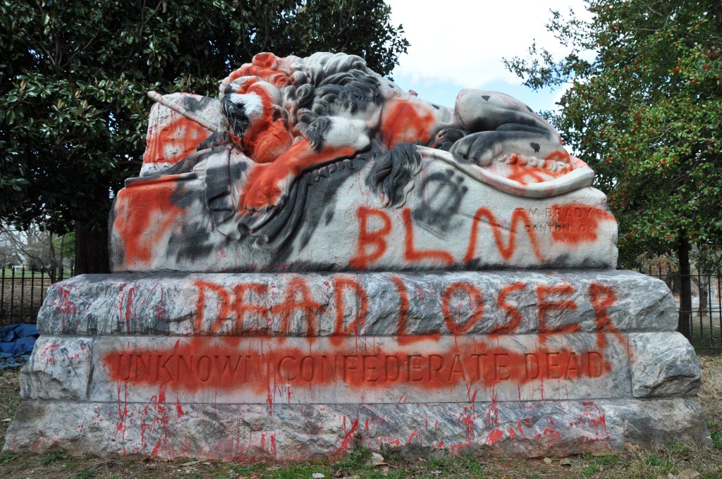 ATLANTA- The confederate monuments at Oakland Cemetery received an update from activists who added “BLM’ and “racist traitor” to the obelisk and Lion of Atlanta. I happened upon it several months later and, after four years of republicans stoking the fires of bigotry, I was thrilled to see the people on the receiving end still fighting to move us forward. It so energized me that I posted photos online to share the experience. I was unprepared for the backlash and reminded that there is no acceptable way to protest and, sadly, of white women’s role in maintaining the patriarchy.