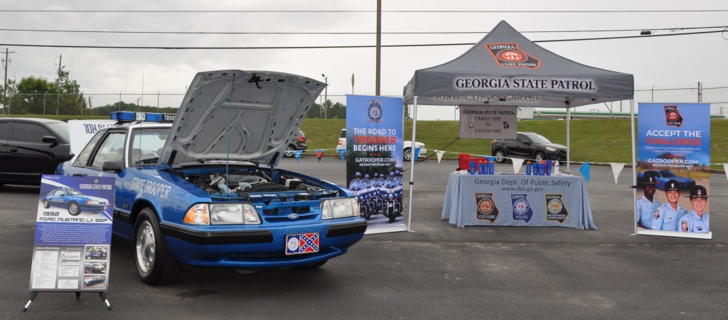 More disturbing was the confederate flag mounted on the front of a 1992 Mustang used by the Georgia State Patrol. The car is immaculate, having been beautifully restored and generally only used for recruiting purposes. Two uniformed white male officers lingered around a tent with the GSP logo, recruiting banners, a table with cups and water bottles to giveaway, and a poster that read, “Georgia State Patrol Takes One to Catch One.” The car sat next to the tent, with its own informational poster, and bright red confederate flag prominently standing out against the blue car. The officer explained the confederate flag was only present as part of the Georgia State flag, the version displayed on the car was historically accurate for the year of the car. I pointed out the license plate did not reflect the state flag, but simply the state symbol and a confederate flag. (Later, a Google search would reveal a front license plate was never official for GSP vehicles, but this particular plate was commonly added, presumably by the officers who used the car.) I shared with the officer that such an image made me feel unsafe, that citizens needed to know they could trust law enforcement to be impartial, and that such a symbol indicated otherwise. He simply looked at me with a sickening, paternalistic smile, and said, “I can assure you, you’re safe.” When I pushed back, he explained the car was privately owned, that it didn’t belong to the GSP, and they couldn’t control what the owner did with the car. I pointed out that the proximity to the official tent, and the presence of uniformed officers gave the impression of state ownership, and that this looked like state sponsored terrorism. He tried to direct the conversation away from the flag by showing me the computer in the car and telling me how much he would love to patrol in this particular vehicle. I thanked him for his time and moved on, aware he was not interested in my opinion. Later, I realized he hadn’t even tried to recruit me.