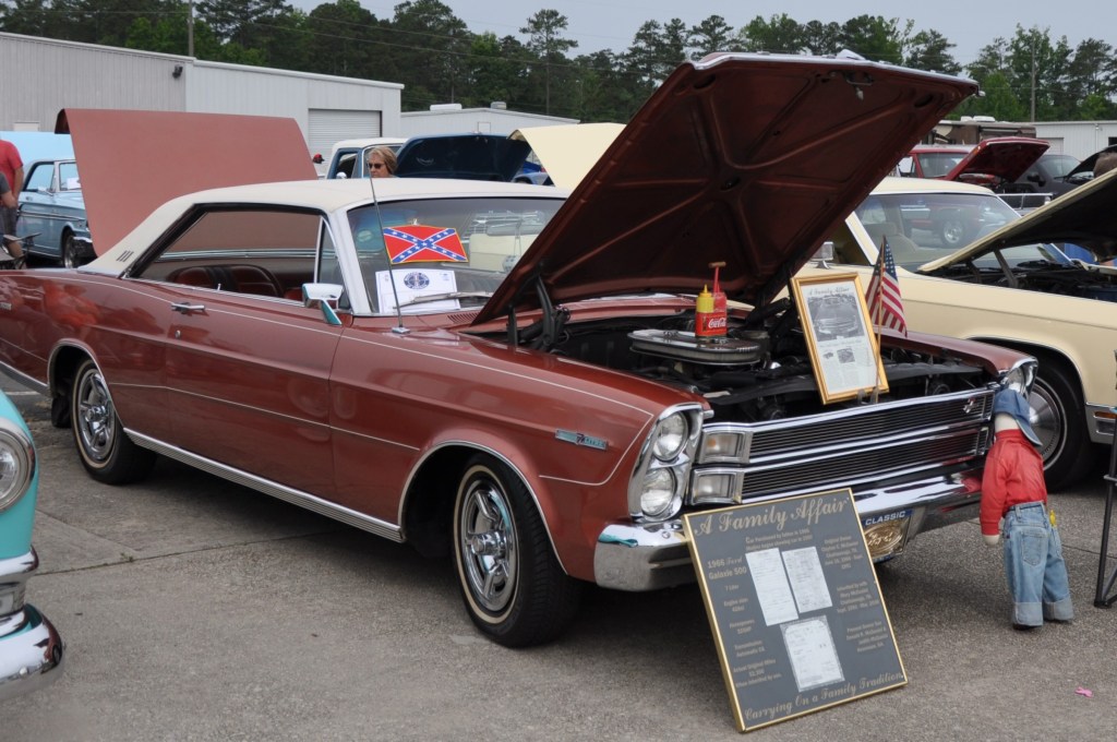 When I approached the older white men sitting with the rust-colored 1966 Ford Galaxie 500, both seemed shocked that I wanted to talk about the confederate flag prominently displayed on the windshield. The owner reported that he had been displaying the flag for 2 or 3 years, and that no one had ever complained, but he assured me that if anyone did, he would remove it. I made clear that I was complaining, and that he couldn’t say that anymore. He ignored me when I asked him directly to make good on his promise and remove it. When I asked why display it at all, his answer was, “We’re in the south” as if that explained everything.