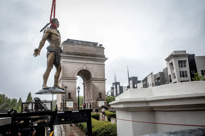 Chief Tomochichi stands proudly at the Millennium Gate Museum at Atlantic Station, his home for the next year or so while they ready his permanent placement at Rodney Cook, Sr. Peace Park in West End. The first photos I saw in the Atlanta Journal-Constitution struck me as wrong, the statue was prone, almost hog-tied with his arms wrapped while they brought him upright. In the next, the rope was positioned around his neck like a noose and he hangs in the air between the truck that delivered him and the pedestal on which he will stand. In some images, white men in hunting camouflage look on. It all feels problematic given the disastrous history of colonization and the attempted genocide of native populations.