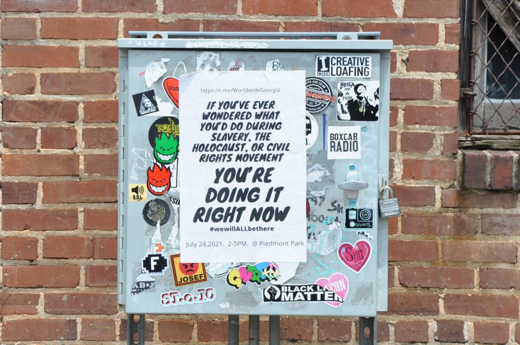 The Victorian garden cemetery stretches for 46 scenic acres in the center of the city. I have often found comfort and serenity in wandering Oakland’s paths, but the confederate monuments have always bothered me. Atlanta likes to think of itself as “the city too busy to hate,” but that has not been my experience. As a masculine gay woman, who identifies as a Big Dyke, I am approached almost daily by people who feel compelled to tell me I’m going to hell if I don’t repent and get right with god. The racism and bigotry here can be quite covert and individual, the State seemingly adopting a “peace at any price” approach, and treating each instance individually to avoid addressing the larger problem and preserve the existing power structure. Although Georgia is 75% urban, rural thinking dominates, empowering bigots and making life difficult for many of us. The confederacy is so common in metro Atlanta that my biggest takeaway from the January republican insurrection at the U.S. Capitol was surprise at the reaction of the rest of the country to the confederate flag in the Capitol; I literally see it on cars and houses every day and even, until recently, on the Georgia state flag. To see it in the U.S. Capitol felt commonplace. It was a wake-up call when others were shocked by the image.